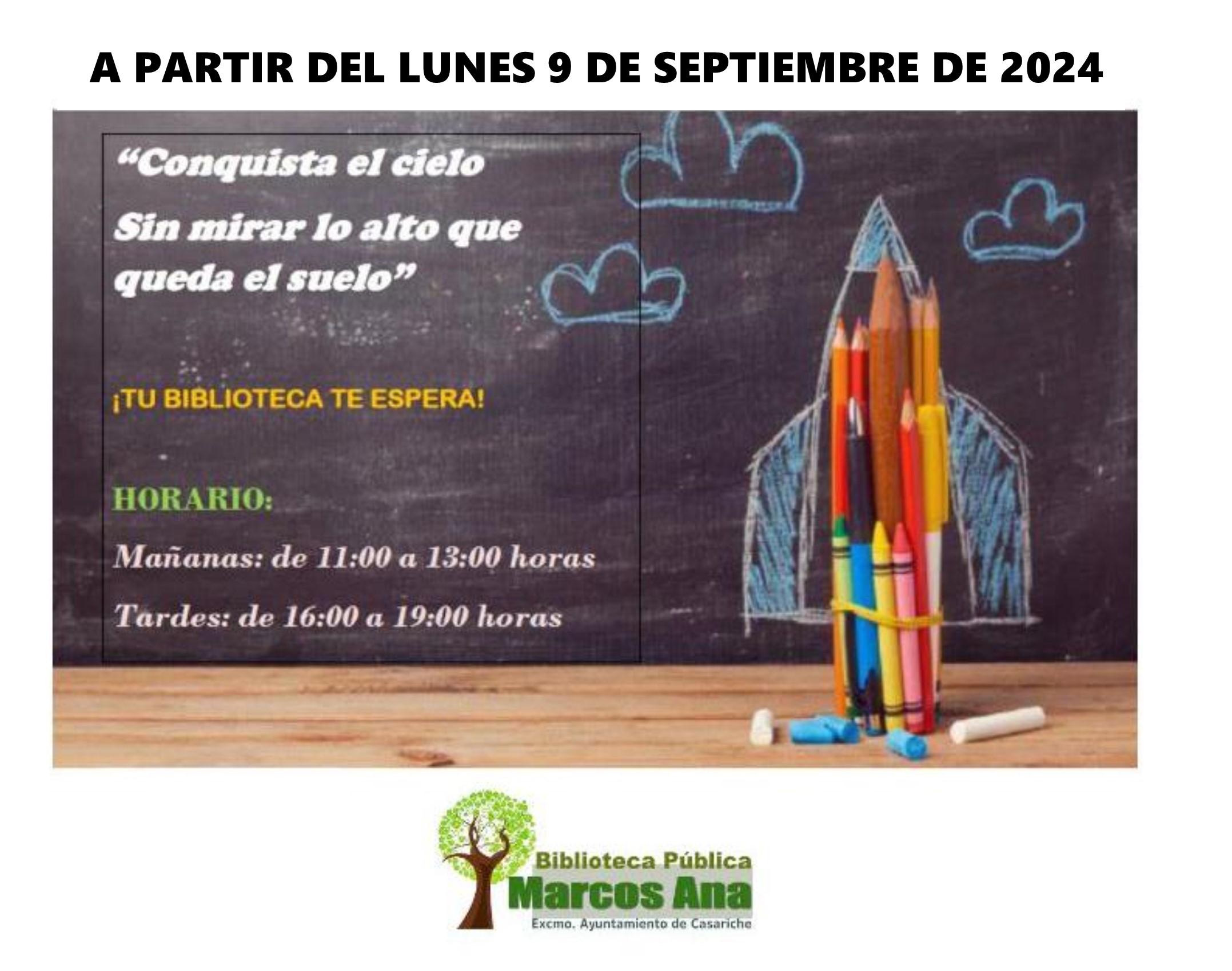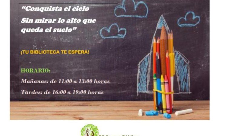 Por lo tanto, a partir del próximo lunes 9 de septiembre las instalaciones de la biblioteca estarán abiertas de lunes a viernes de 11:00h de la mañana a 13:00h del mediodía y desde las 16:00h hasta las 19:00h en horario de tarde.