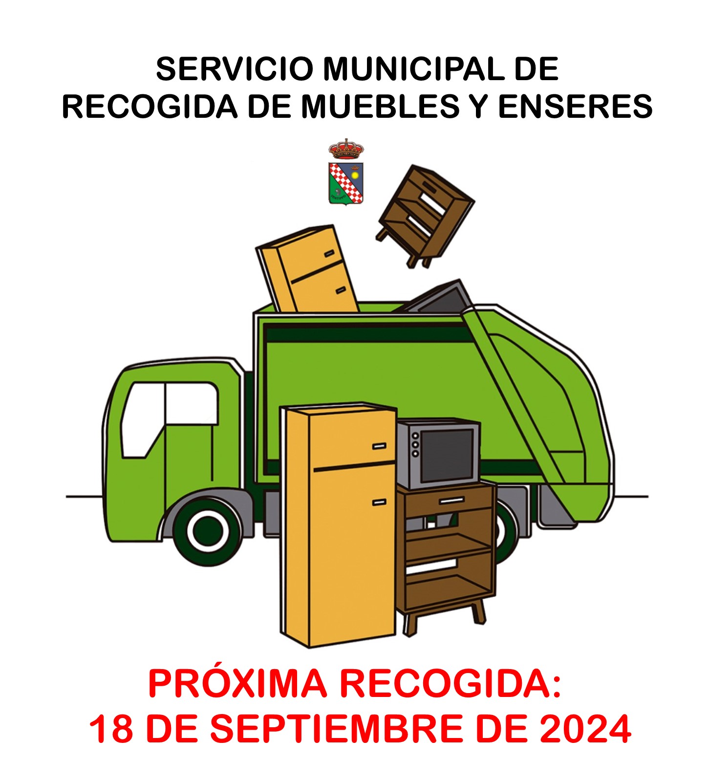 Como ya viene siendo habitual, informamos de una nueva recogida de muebles y enseres a domicilio. En esta ocasión, el día previsto para llevar a cabo esta tarea será el miércoles 18 de septiembre.