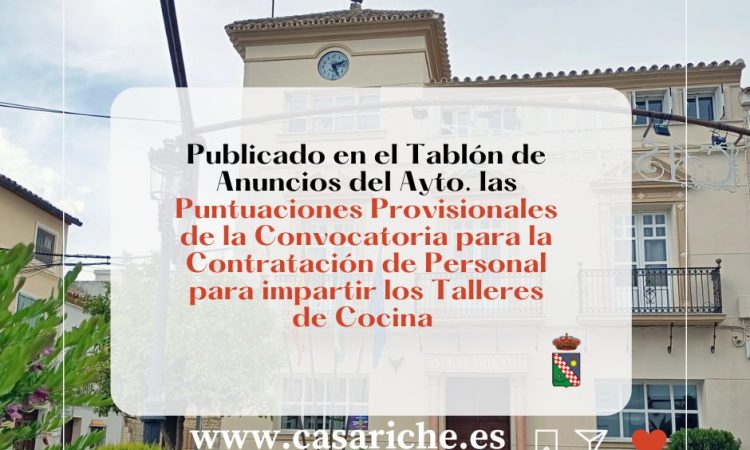 Desde la Delegación de Empleo informamos a todos los vecinos y vecinas de Casariche que ya están disponibles, tanto en el Tablón de Anuncios de nuestro Ayuntamiento como en el E-tablón, las Puntuaciones Provisionales de los/as Aspirantes Admitidos a la Convocatoria para la Contratación de Personal para impartir los Talleres de Cocina dirigidos a niños, jóvenes y adultos.