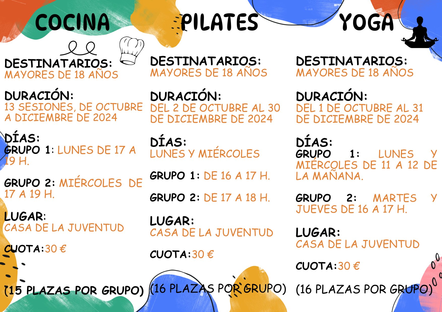 La cuota de participación en cada uno de ellos es de 30€ por persona, y un límite de 16 plazas por grupo en el caso de los talleres de pilates y yoga y de 15 plazas por grupo en el de cocina.