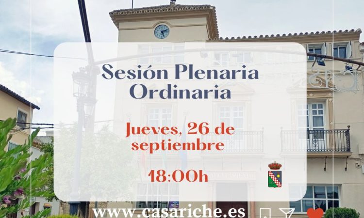Informamos a todos nuestros vecinos y vecinas que mañana jueves 26 de septiembre a las 18:00h de la tarde se celebrará una sesión plenaria de carácter ordinario en el Salón de Plenos Municipal, que consta del siguiente orden del día: