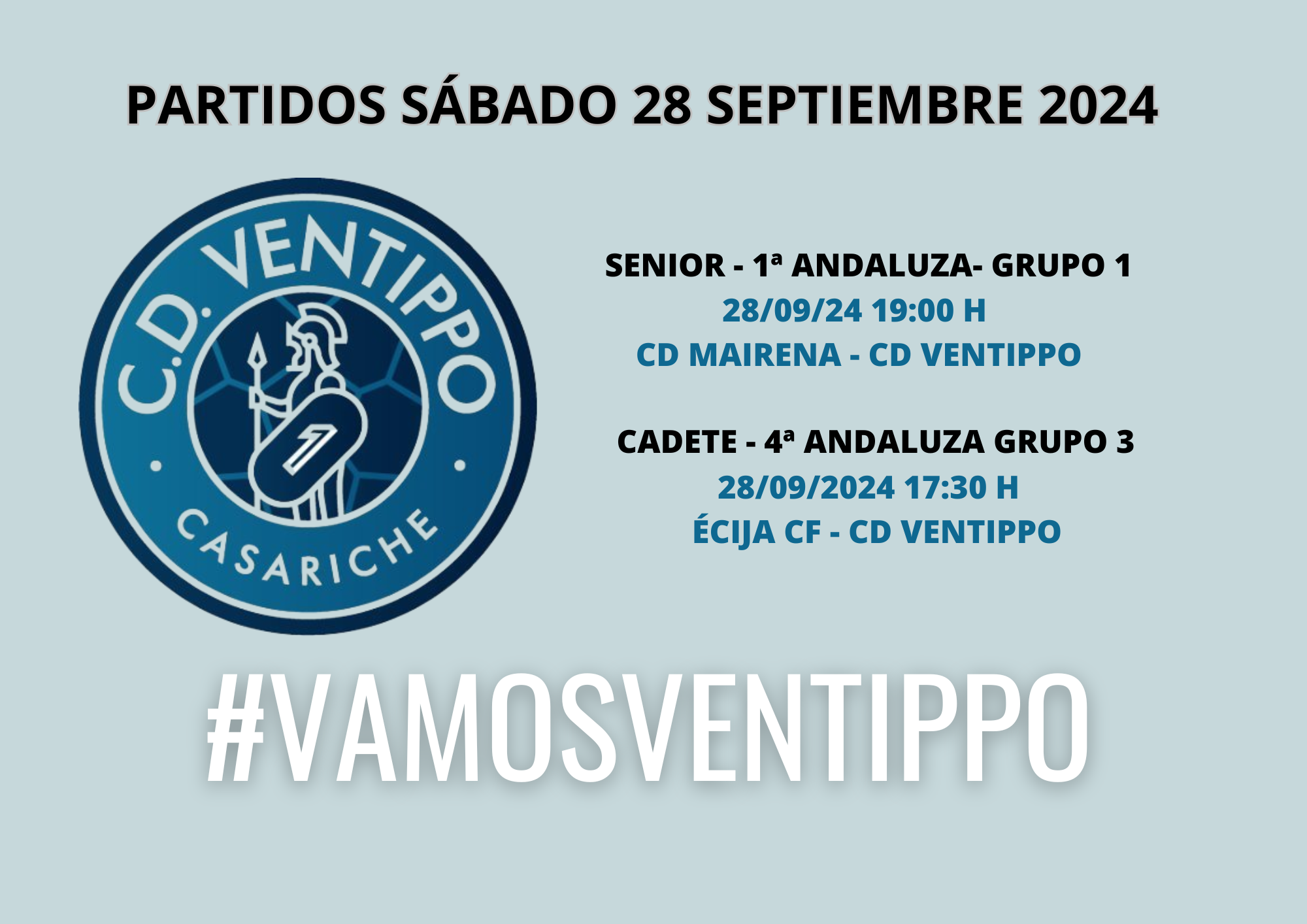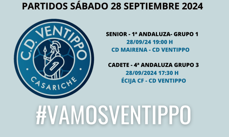 Nuestros cadetes se enfrentan al Écija, CF, a las 17:30h, en su primer partido de liga, y nuestros seniors juegan fuera, a las 19:00h, contra el CD Mairena. Con respecto a la semana pasada, el CD Ventippo senior venció en casa por 6 a 0 al CD Utrera.