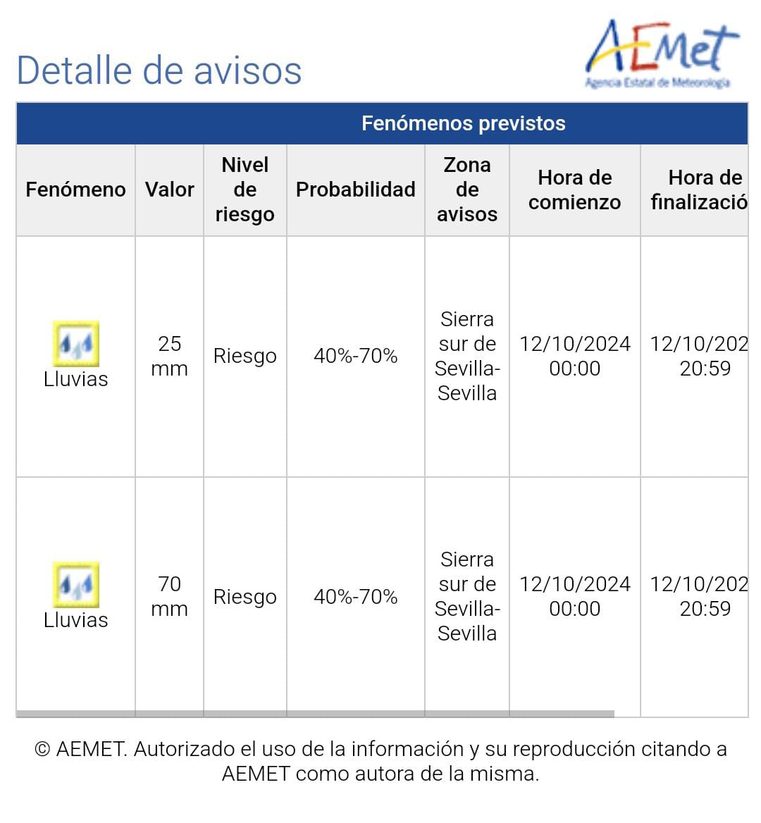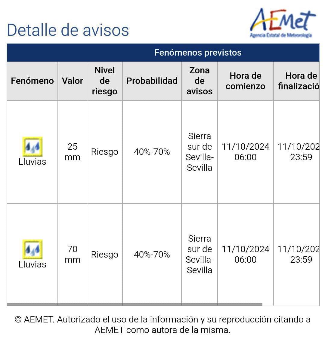 El Ayuntamiento informa que, de acuerdo a la información facilitada por la Agencia Estatal de Meteorología, AEMET, llega un fin de semana con previsiones meteorológicas adversas, ya que se esperan lluvias en la Sierra Sur de Sevilla, desde las 06:00h de mañana viernes 11 de octubre hasta las 20:59h del sábado día 12.