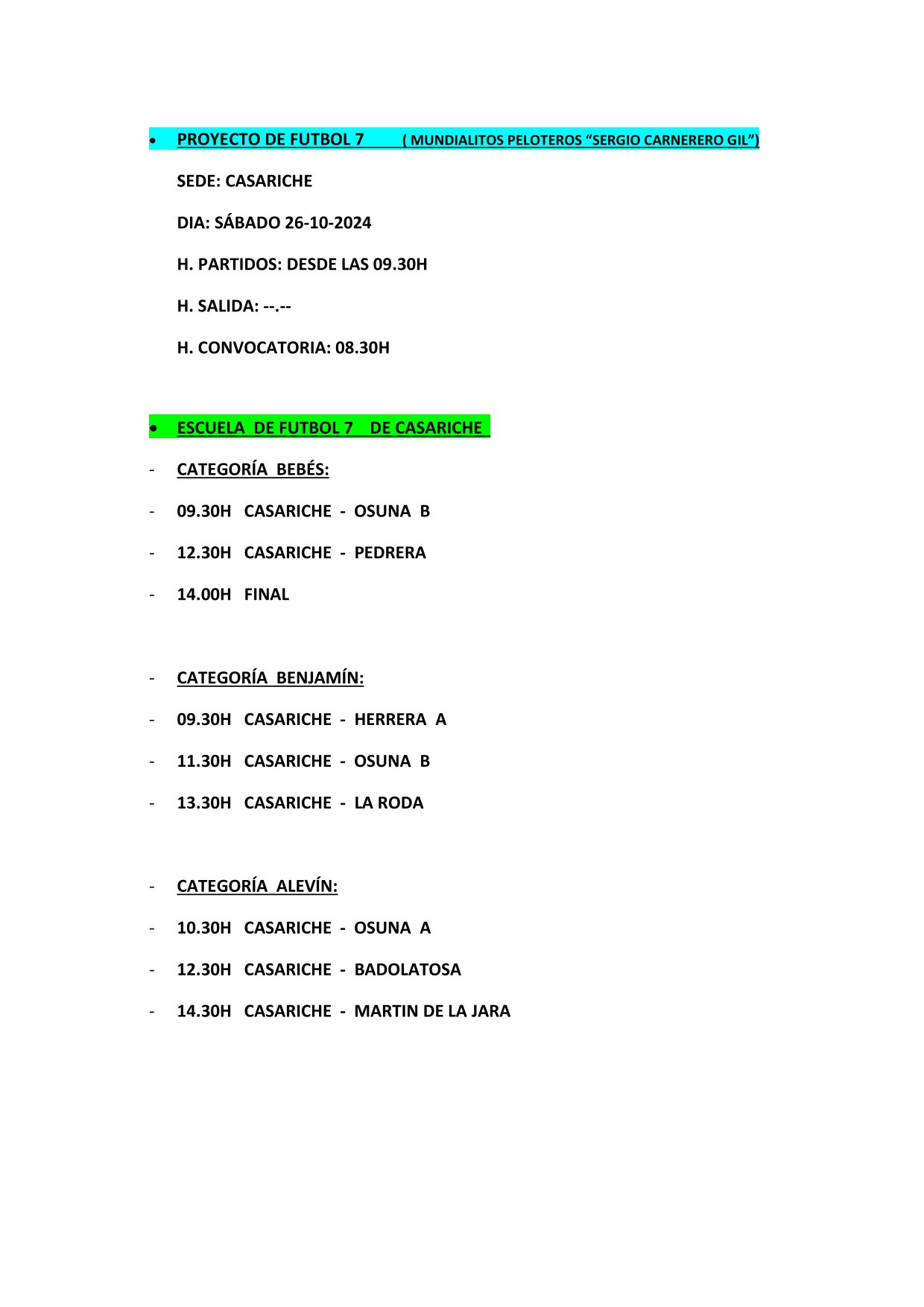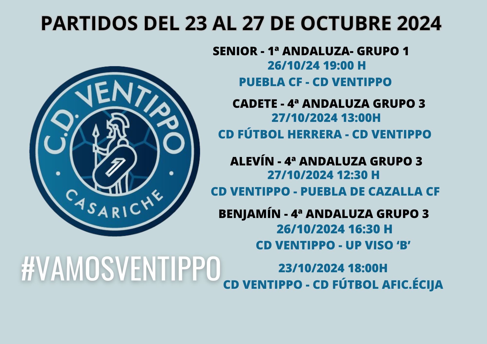 Las actividades deportivas con participación casaricheña de esta semana comienzan hoy miércoles 23 de octubre a las 18:00h en el Sergio Carnerero Gil, donde se juega un partido atrasado entre los benjamines del CD Ventippo y el CD Fútbol Aficionado de Écija.
