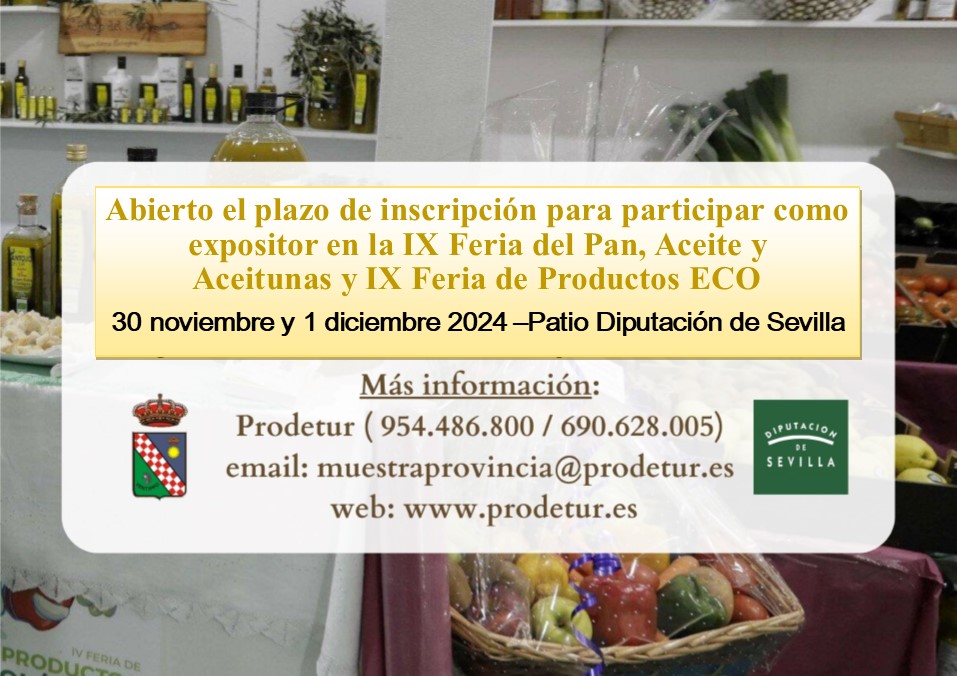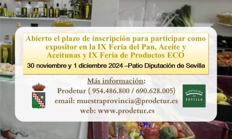 El Ayuntamiento informa que, hasta las 12:00 horas del próximo lunes 18 de noviembre, permanecerá abierto el plazo de inscripción para participar como expositor en la IX Feria del Pan, Aceite y Aceitunas y IX Feria de Productos ECO.