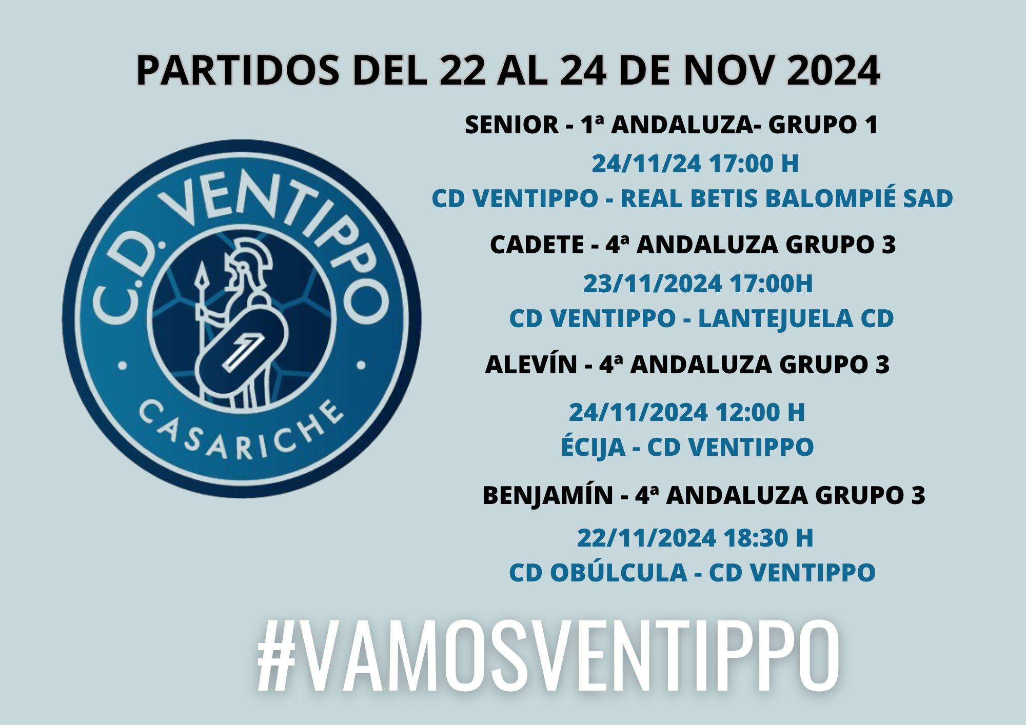 El domingo 24 juegan fuera los alevines, que se enfrentan al mediodía contra el Écija CF y, por la tarde, volvemos a tener partido en el Sergio Carnerero Gil, ya que nuestros seniors juegan contra el Real Betis Balompié SAD.