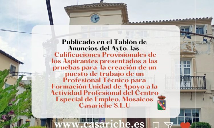 Desde la Delegación de Empleo informamos que ya se puede consultar tanto en el Tablón de Anuncios del Ayuntamiento como en el E-Tablón el Listado de Calificaciones Provisionales de los Aspirantes presentados a las pruebas para la creación de un puesto de trabajo de un Profesional Técnico para Formación Unidad de Apoyo a la Actividad Profesional del Centro Especial de Empleo, Mosaicos Casariche S.L.U.
