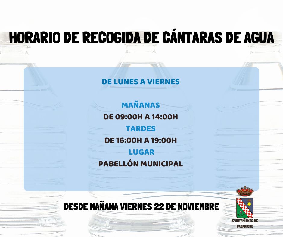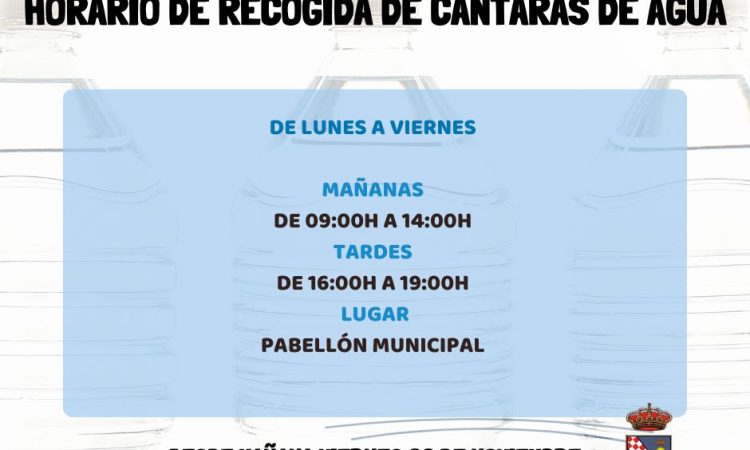 Informamos que mañana viernes, 22 de noviembre comienza la recogida de cántaras de agua que se ha puesto a disposición de todos los vecinos y vecinas de la localidad en el Pabellón Municipal.