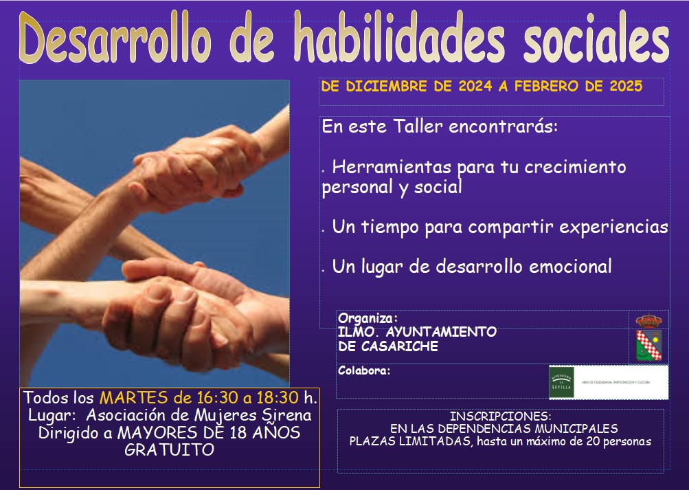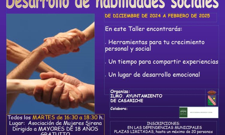 A partir del lunes 25 de noviembre permanecerá abierto el plazo de inscripción para apuntarse en el nuevo Taller de Habilidades Sociales puesto en marcha por el Ayuntamiento en colaboración con la Diputación de Sevilla.