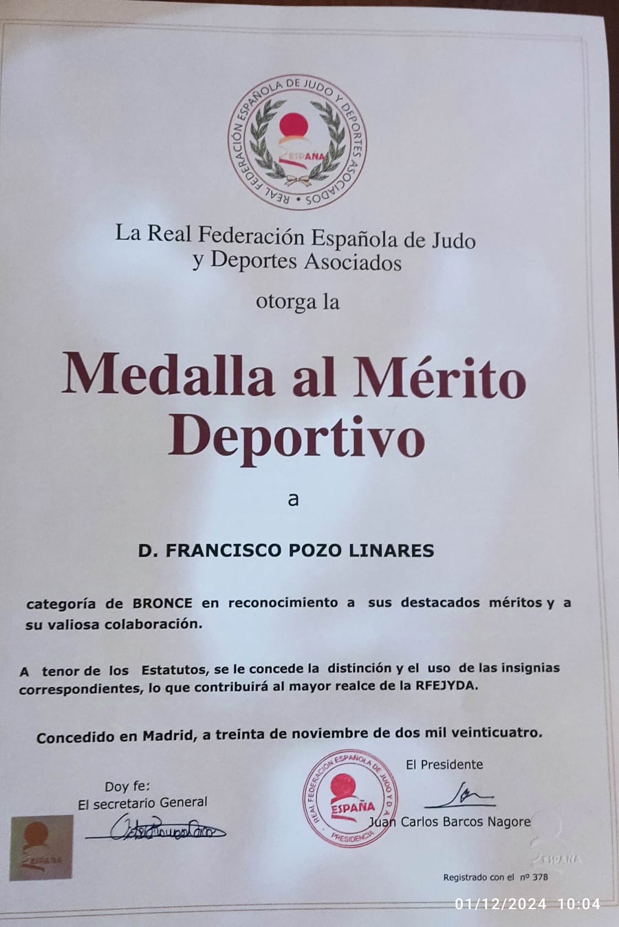 Seguimos dando buenas noticias relacionadas con los deportistas de Casariche. El casaricheño Francisco Pozo Linares ha recibido la Medalla de Bronce al Mérito Deportivo de la Real Federación Española de Judo y Deportes Asociados (RFEJYDA), un reconocimiento a sus destacados méritos y a su valiosa colaboración en estos deportes.
