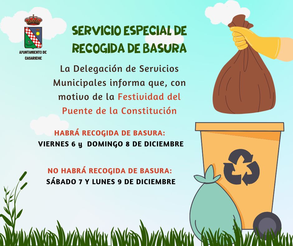 La Delegación de Servicios Municipales del Ayuntamiento informa que, debido a las próximas festividades del Día de la Constitución y de la Inmaculada Concepción en las noches del 7 y 9 de diciembre no habrá servicio de recogida de basura.
