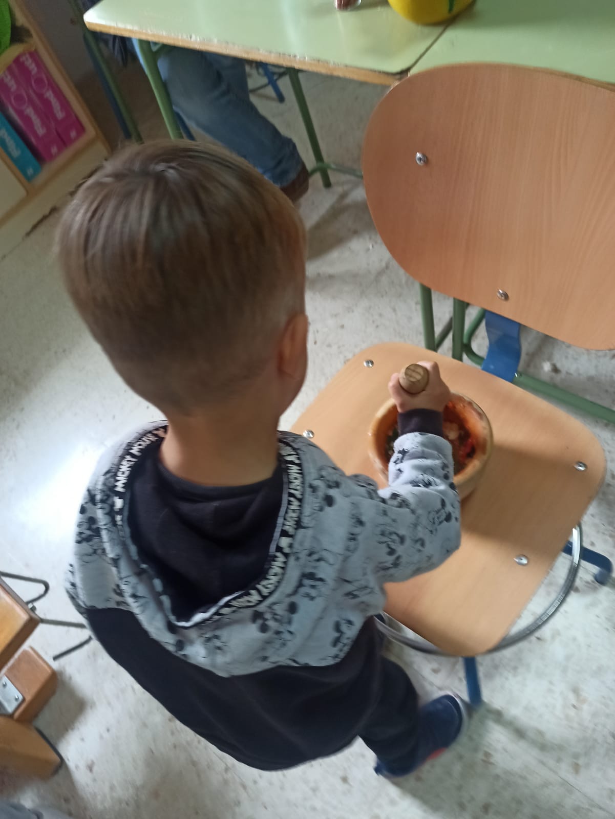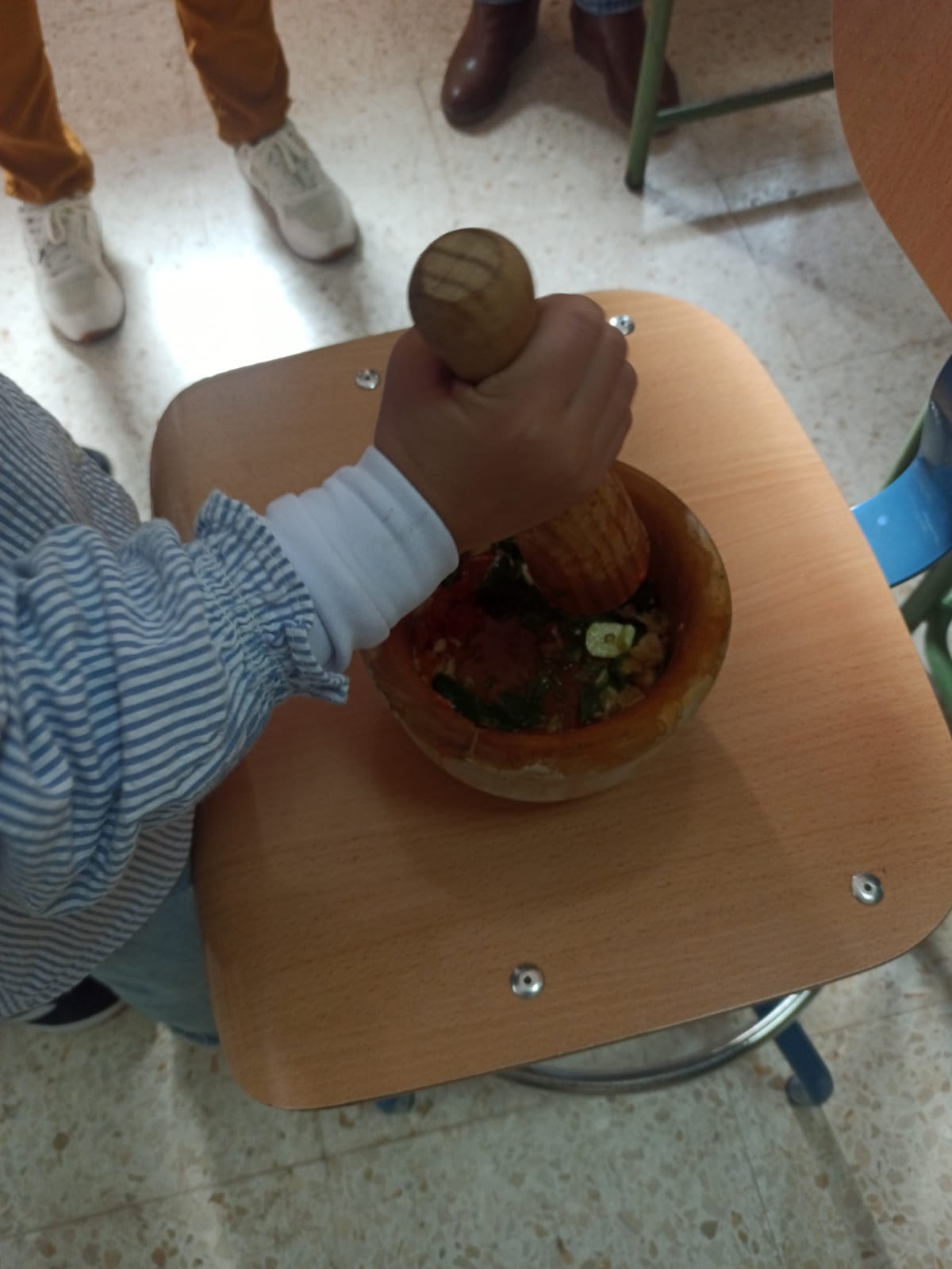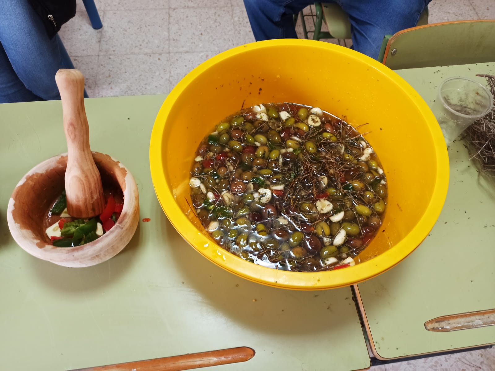- 2ª Fase: Aliño de Aceitunas: ejecutada los días 2 (lunes) y 3 (martes) de diciembre, en horario de 9:00 a 13.30 h, durante los cuales todas las clases volvieron a pasar por la Antigua Aula de Música, esta vez para aprender a aliñar las aceitunas. Cada clase llevó su tarro de aceitunas tras el cambio de agua. Las personas voluntarias y la Técnica de Igualdad del Ayuntamiento de Casariche les explicaron qué ingredientes utilizar para el aliño de las aceitunas. Alumnas y alumnos de cada clase se encargaron de aliñar sus propios tarros de aceitunas. A partir de ahora, se esperarán varios días para que tomaran el aliño.