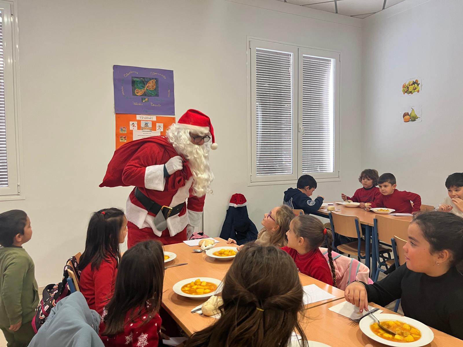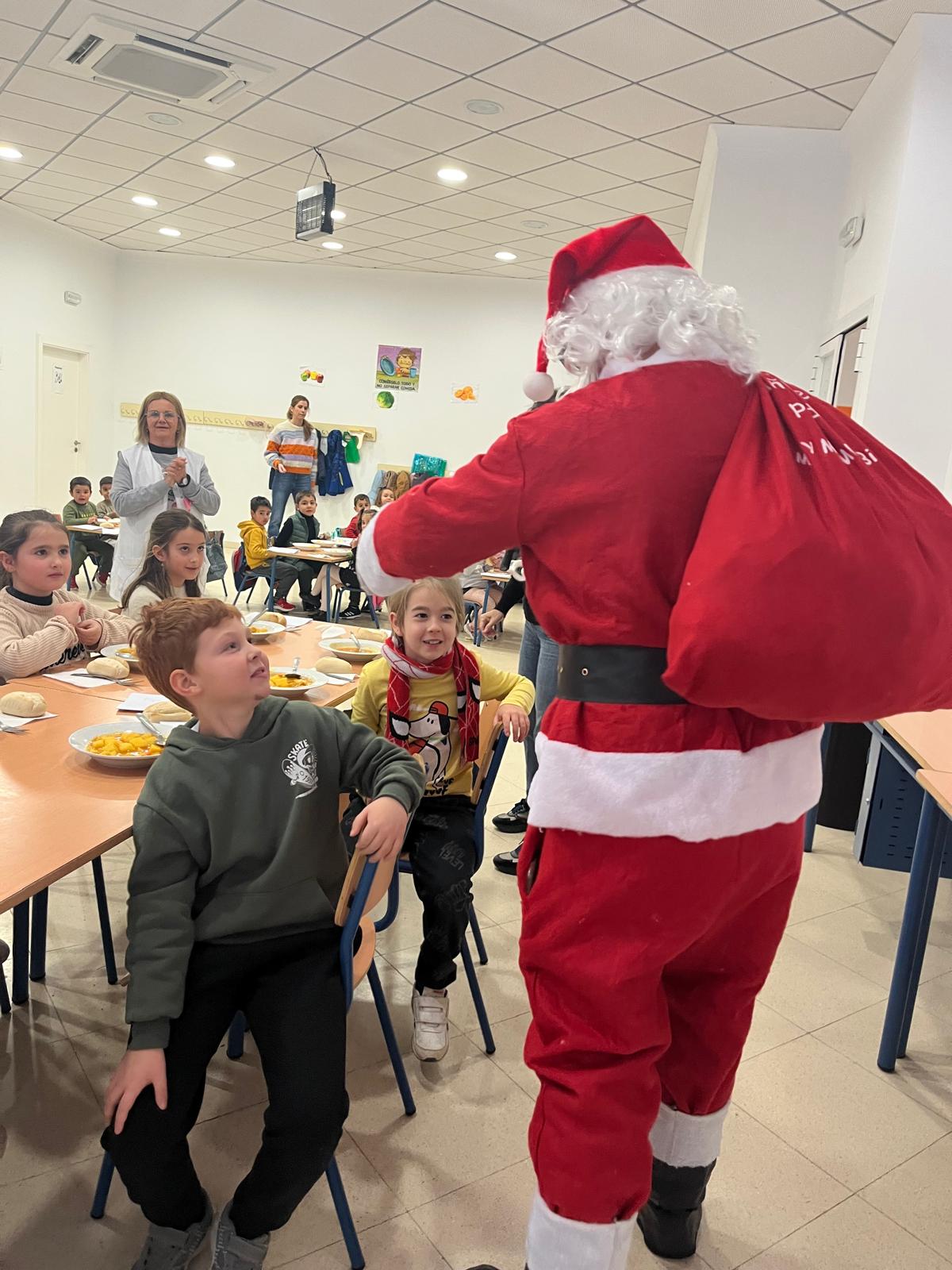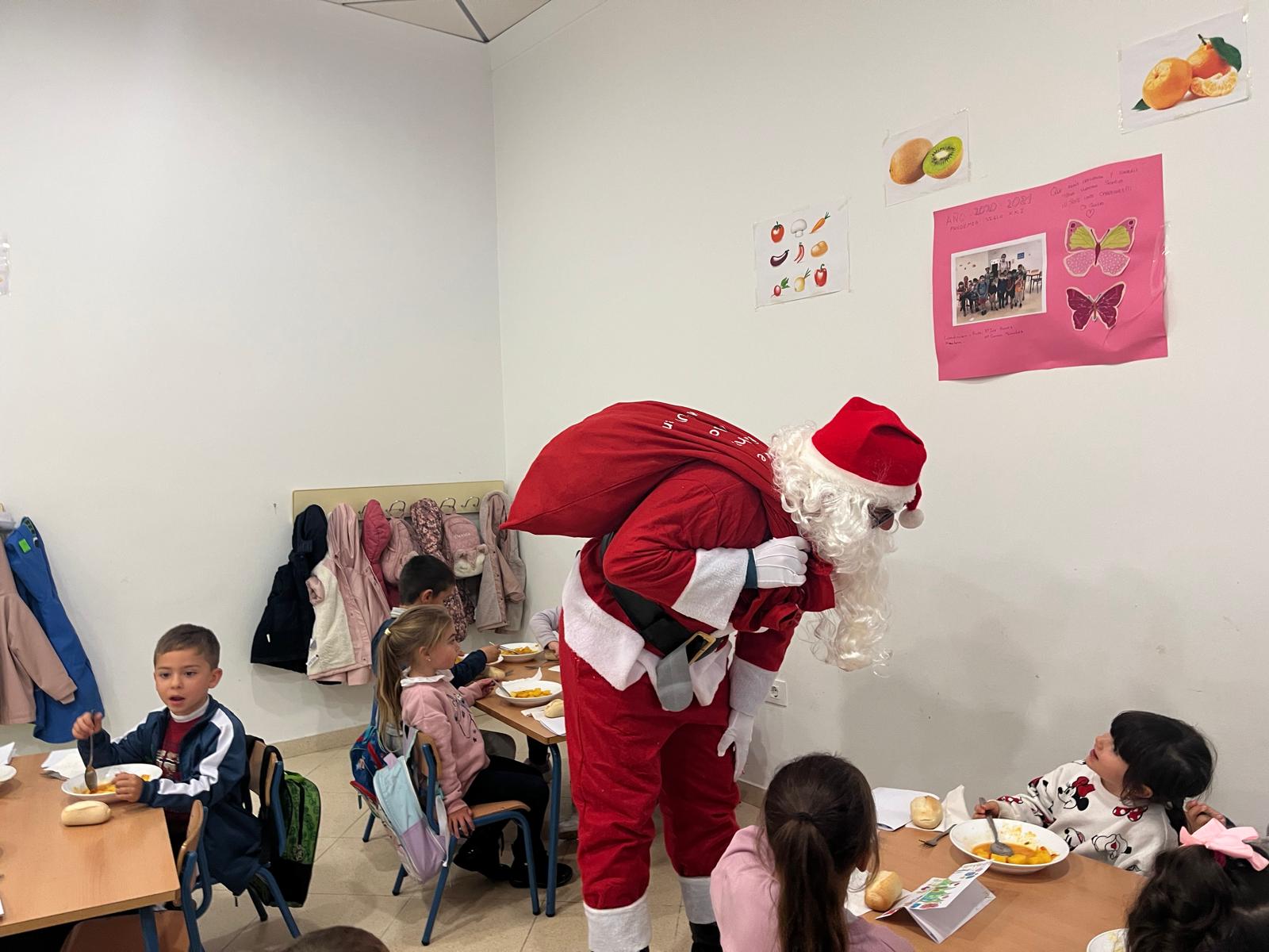 El comedor escolar recibió ayer la visita de Papá Noel, algo que sorprendió gratamente a todos los niños y niñas que se encontraban almorzando, que además de saludarle, pudieron contarle sus peticiones para estas fiestas.