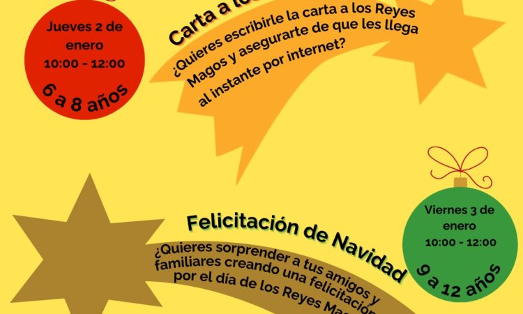 El 2 de enero, de 10:00h a 12:00h se realizará un taller dirigido a niños/as de 6 a 8 años para escribir la carta a los Reyes Magos y que ésta les llegue directamente por internet.