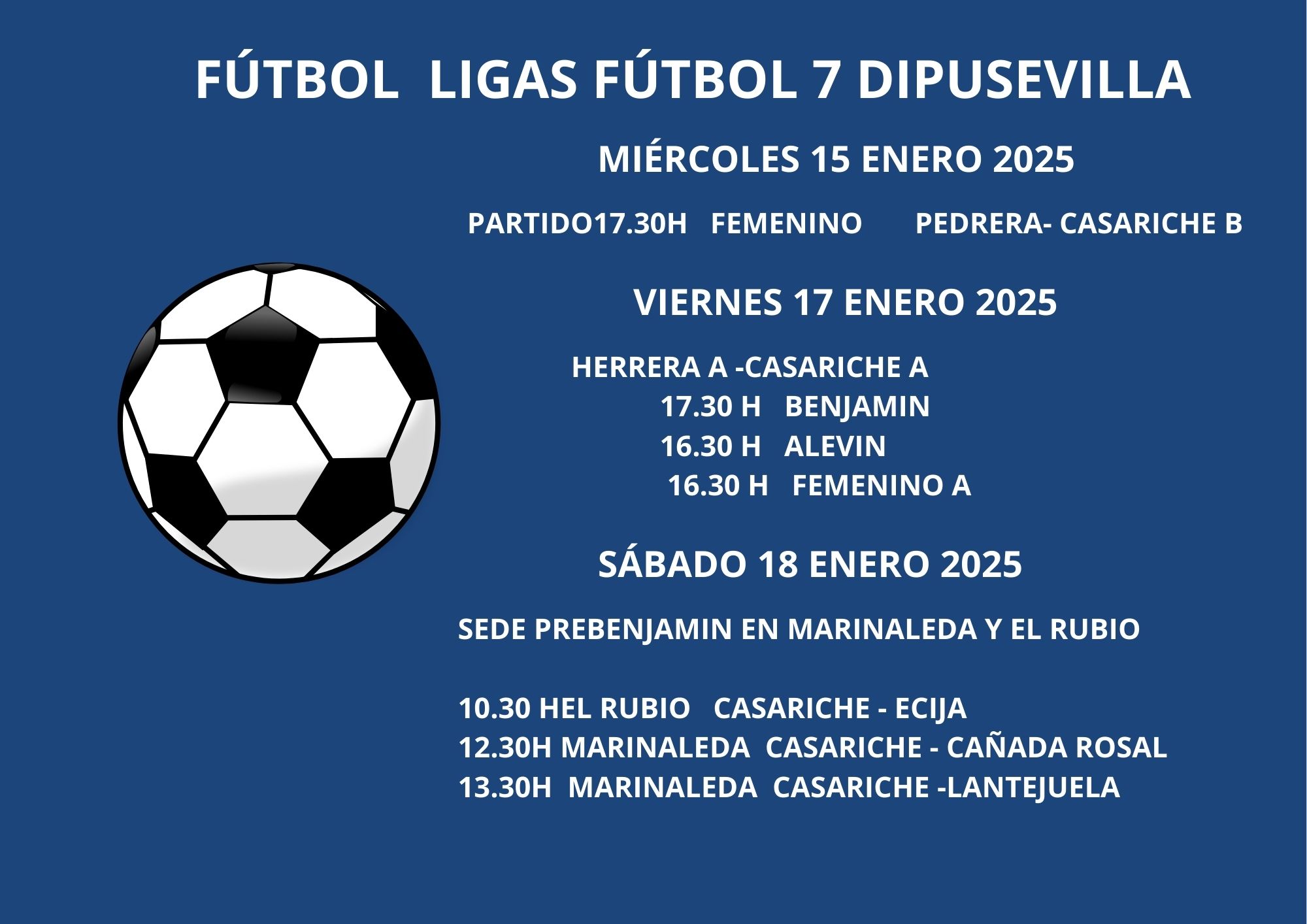 Las actividades deportivas con participación casaricheña de esta semana arrancaron ayer miércoles con un partido del equipo femenino B en Pedrera. Continuando con la escuela de fútbol de Casariche, mañana viernes 17 juegan en el Sergio Carnerero Gil los benjamines, alevines y el equipo femenino A , que compiten contra Herrera y el sábado 18 juegan los prebenjamines en El Rubio y en Marinaleda.