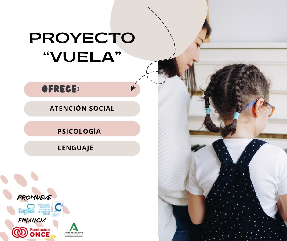 Desde el Ayuntamiento, nos hacemos eco de la comunicación recibida de la Federación Andaluza de Familias de Personas Sordas (FAPAS) informando que ha vuelto a poner en marcha el proyecto integral VUELA, un servicio de atención integral que viene a paliar las necesidades de las personas con discapacidad auditiva en todas las áreas de atención y que está financiado por la Consejería de Inclusión Social, Juventud, Familias e Igualdad y por la Fundación ONCE.