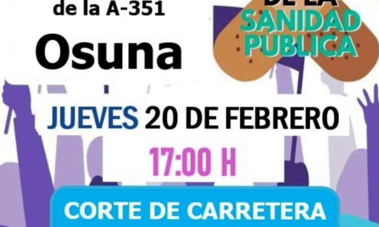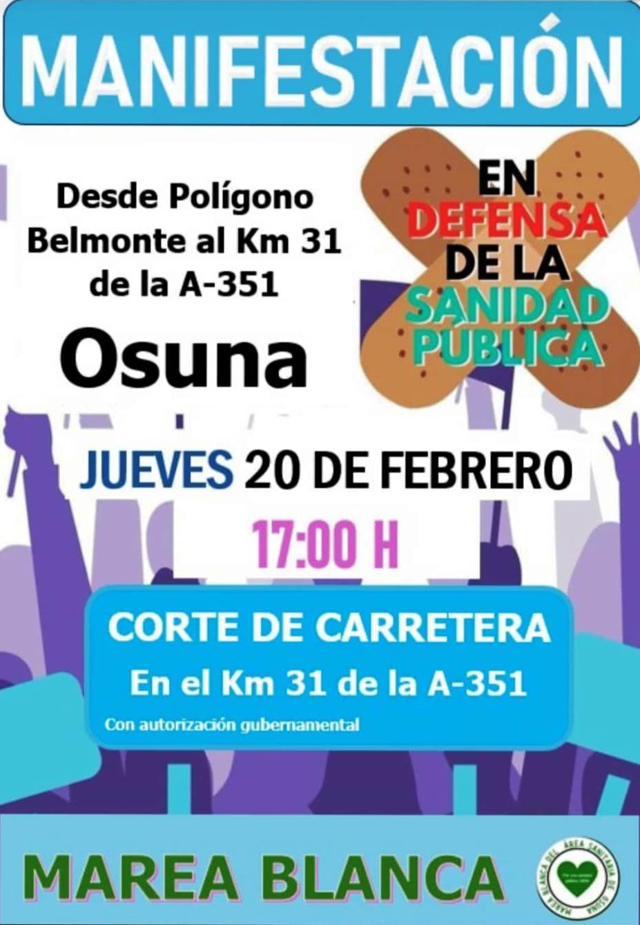 Marea Blanca ha convocado una manifestación en defensa de la Sanidad Pública que se llevará a cabo este jueves 20 de febrero en Osuna. Se trata de una manifestación que comenzará a las 17:00 horas desde en el Polígono Belmonte y se dirigirá hasta el kilómetro 31 de la carretera A-351, donde se realizará un corte de carretera.