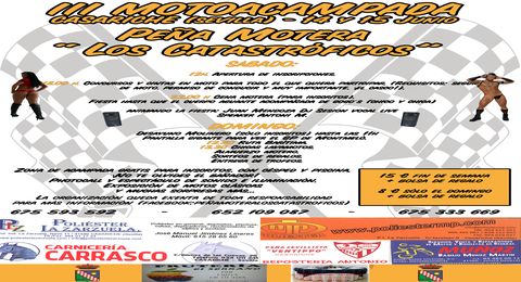 Este fin de semana, durante los días 14 y 15 de junio, se celebra en nuestro municipio “III Motoacampada Casariche”, organizada por la Peña Motera de “Los Catastróficos” y que cuenta, entre otros, con la colaboración del Ayuntamiento de Casariche. Para la ocasión, se habilitará una zona de acampada con césped y piscina, ubicada en la Piscina Municipal de Casariche.