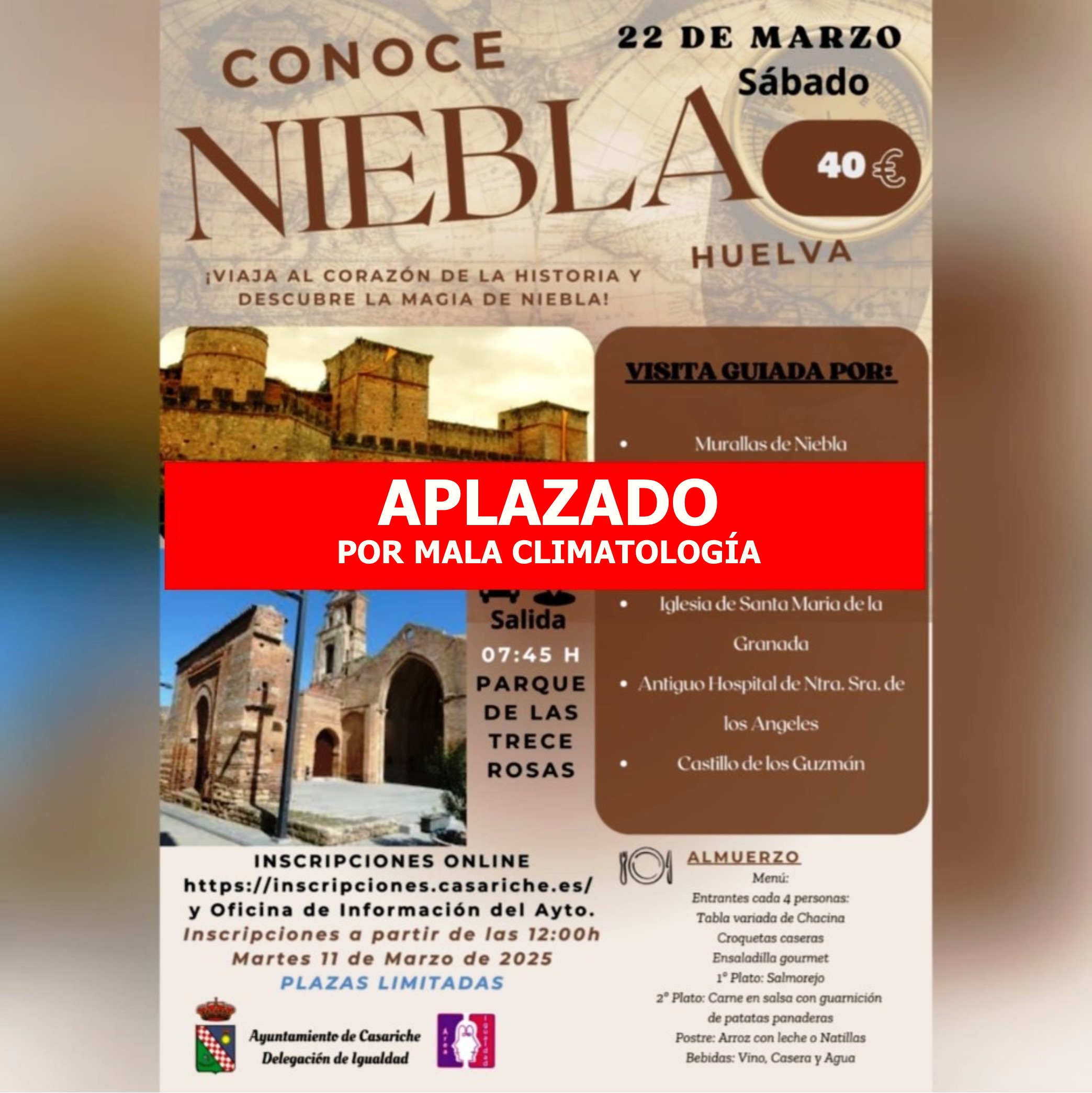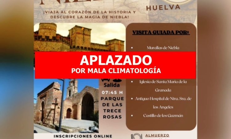 Informamos que debido a la mala climatología prevista para los próximos días, con la entrada de una nueva borrasca, y a que el estado de las carreteras no es el más adecuado para realizar desplazamientos que no sean estrictamente necesarios, se ha decidido aplazar hasta nueva fecha el viaje a la localidad onubense de Niebla previsto para este sábado 22 de marzo.