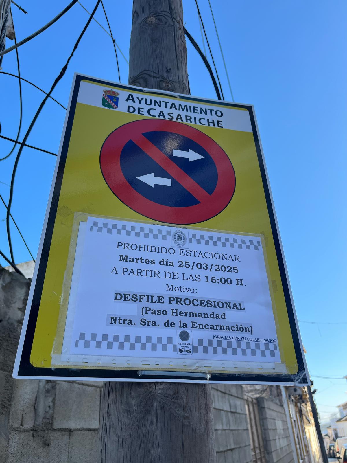 Desde la Delegación de Tráfico informamos que por motivo de la onomástica de Ntra. Sra. de la Encarnación y su correspondiente del desfile procesional, mañana martes 25 de marzo estará prohibido aparcar a partir de las 16:00h de la tarde en las calles de la localidad por las que procesionará nuestra patrona.
