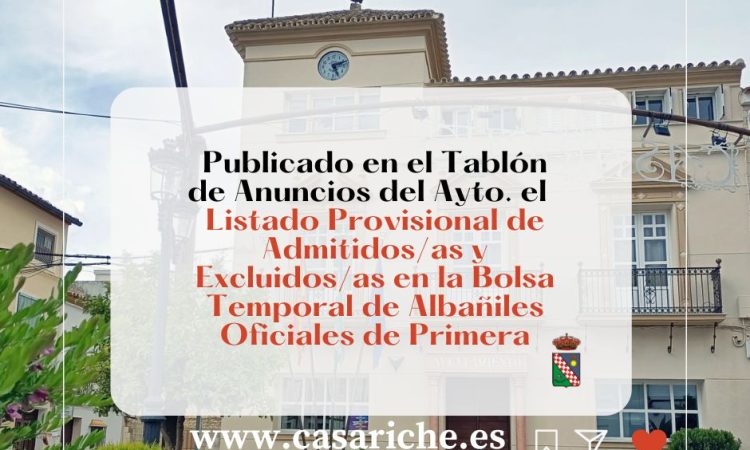 Desde la Delegación de Empleo informamos a todos los vecinos y vecinas de Casariche que ya está disponible, tanto en el Tablón de Anuncios de nuestro Ayuntamiento como en el E-tablón, el Listado Provisional de Admitidos/as y Excluidos/as en la Bolsa Temporal de Albañiles Oficiales de 1ª.
