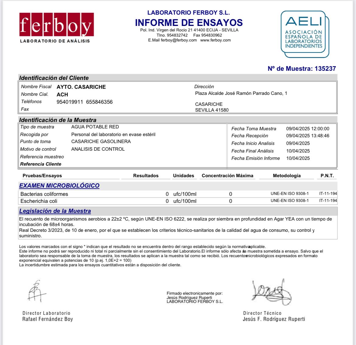 Tras los bulos extendidos sobre la salubridad del agua en nuestra localidad, tal y como informamos hace unos días y, para mayor tranquilidad de la ciudadanía, se solicitaron nuevas analíticas en cinco zonas de muestreo diferentes de Casariche.