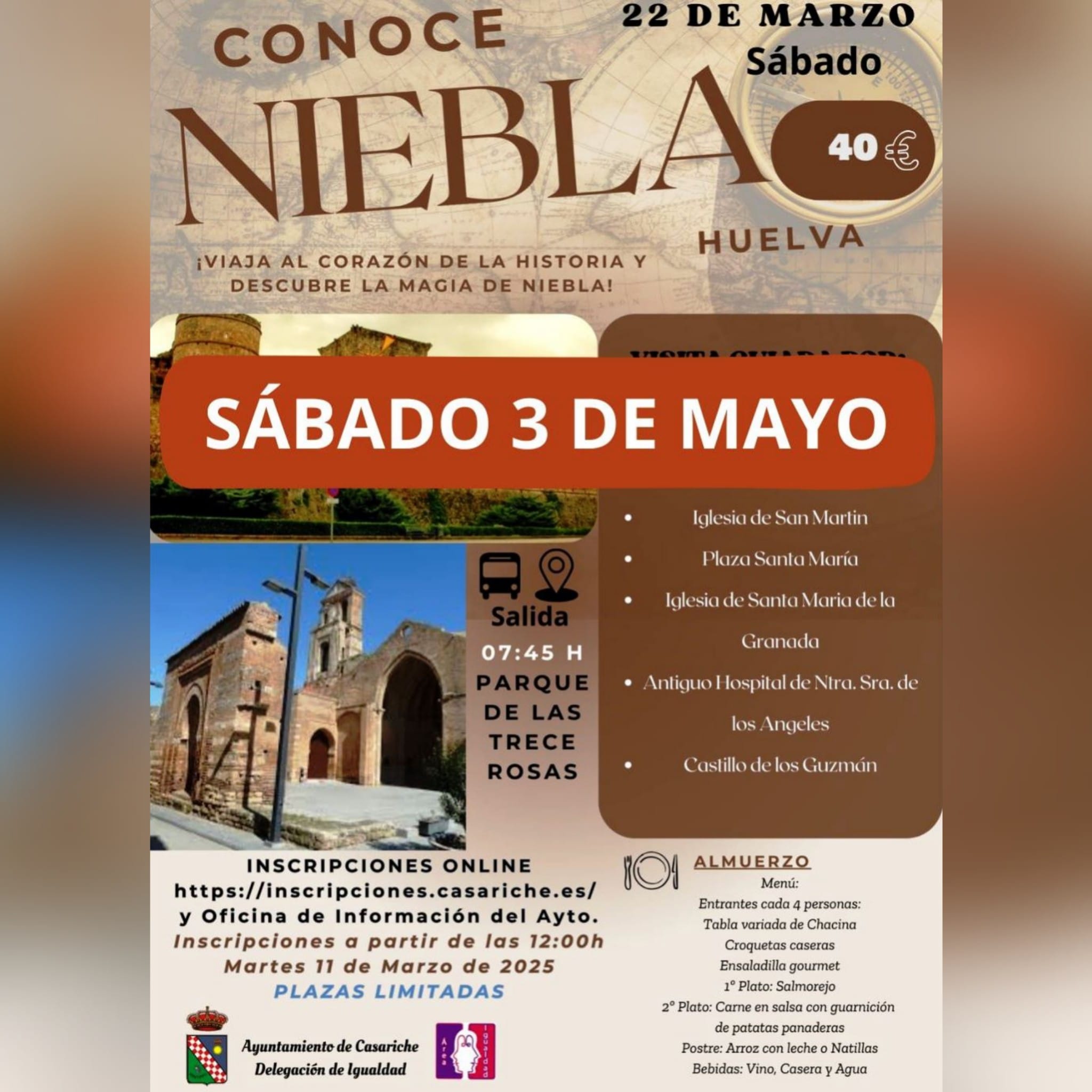 Desde la Delegación de Igualdad informamos que el viaje de convivencia a la localidad onubense de Niebla, cuya realización hubo que posponer, se realizará finalmente este sábado 3 de mayo.