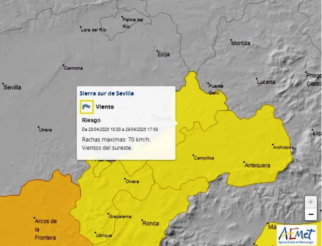 La AEMET ha lanzado una alerta amarilla por fuertes rachas de viento hasta las 18:00h de hoy martes 29 de abril en la Sierra Sur de Sevilla.