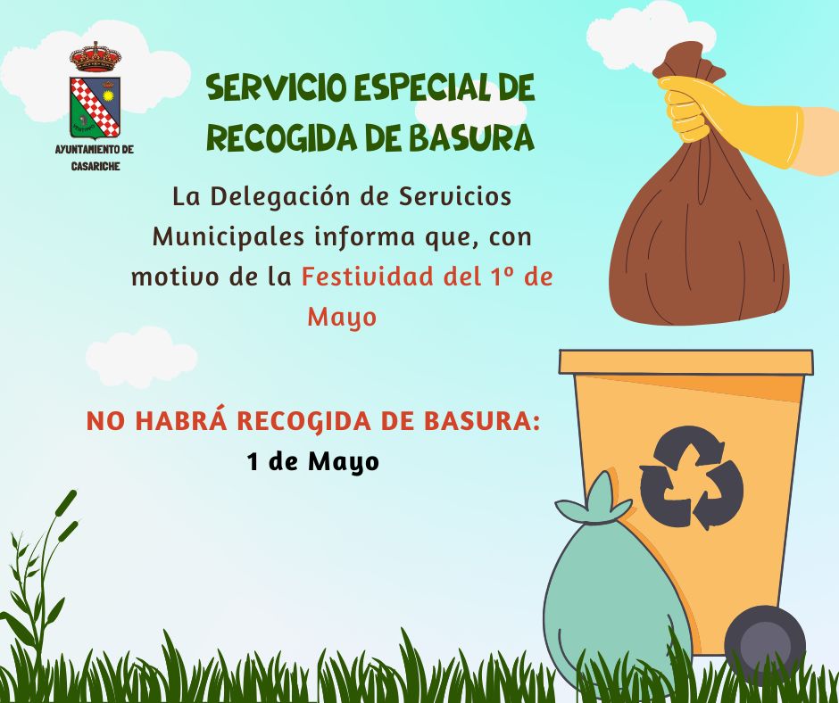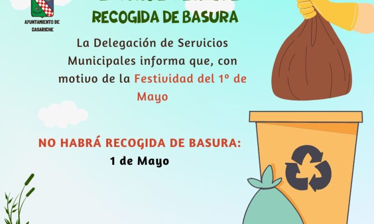 La Delegación de Servicios Municipales del Ayuntamiento informa que, con motivo de la festividad del 1 de mayo, Día de todos los trabajadores y trabajadoras, la noche del jueves al viernes no habrá servicio de recogida de basura.