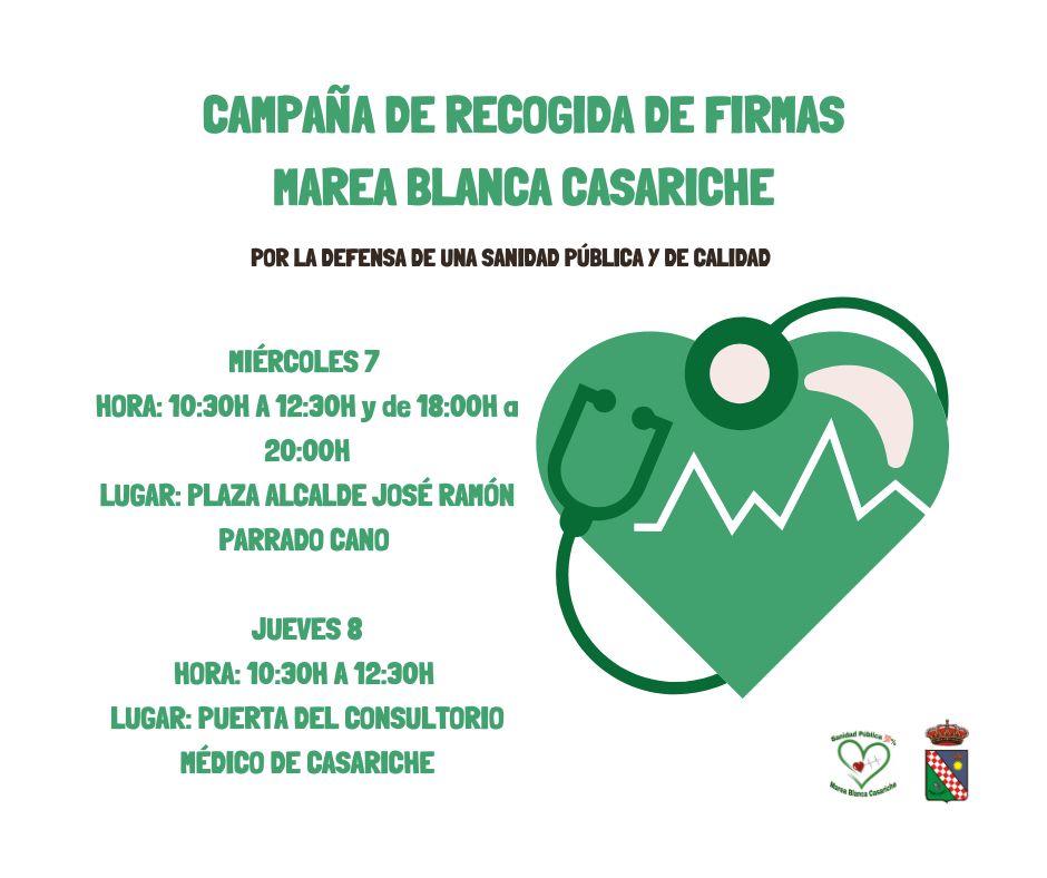 Ante la gran acogida que está teniendo en nuestra localidad la recogida de firmas programada para los días 7 y 8 de mayo, Marea Blanca Casariche ha decidido ampliar el horario del miércoles 7, incorporando también la tarde. De este modo, quienes no puedan acudir por la mañana tendrán la oportunidad de participar por la tarde.