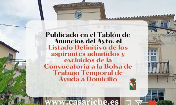 Desde la Delegación de Empleo informamos que ya se puede consultar tanto en el Tablón de Anuncios de nuestro Ayuntamiento como a través del E- Tablón el Listado Definitivo de Aspirantes Admitidos y Excluidos de la Bolsa Temporal de Ayuda a Domicilio.