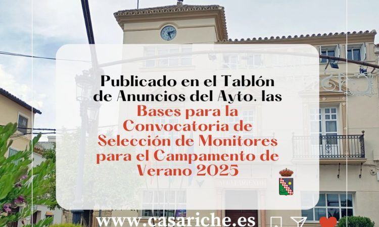 Desde la Delegación de Empleo informamos que ya se pueden consultar tanto en el Tablón de Anuncios del Ayuntamiento así como en el E- tablón las Bases de la Convocatoria para la selección de Monitores para Campamento Verano 2025