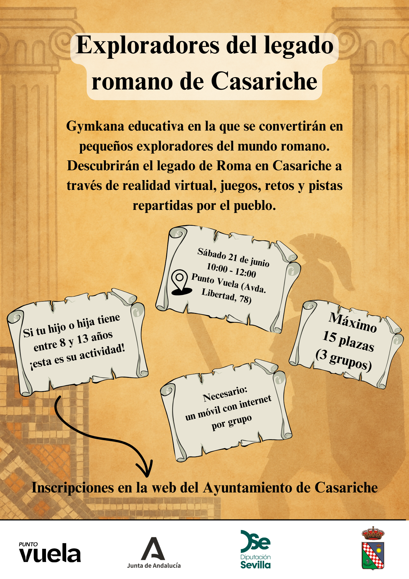 Esta gymkana educativa y dinámica convertirá a los pequeños y pequeñas participantes en auténticos exploradores del pasado romano de nuestro municipio. A través de diversas pruebas repartidas por diferentes zonas del pueblo, los niños descubrirán elementos clave de la antigua Roma presentes en la historia y patrimonio local.