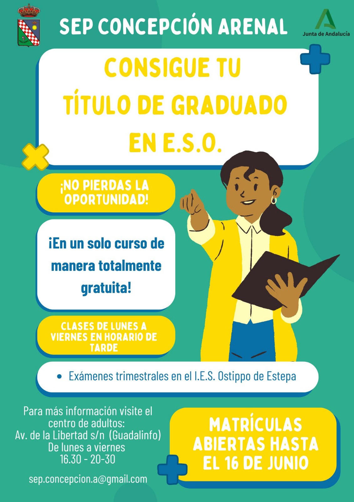 Desde el Ayuntamiento te recordamos que tienes la oportunidad de obtener el Título de Graduado en Educación Secundaria Obligatoria (ESO) a través de tutorías de apoyo al estudio, completamente gratuitas y en tan sólo un curso.