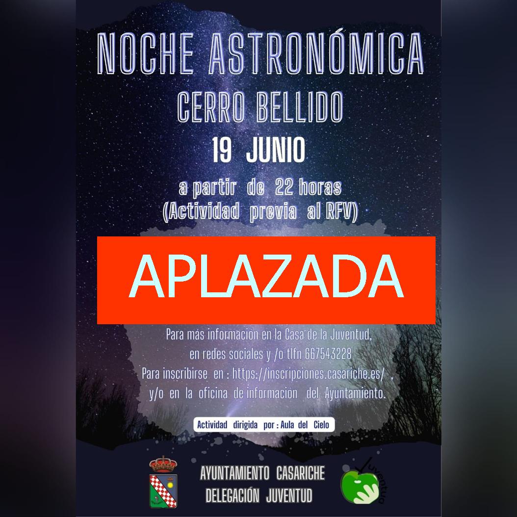 Debido a las desfavorables condiciones meteorológicas previstas para esta noche, la actividad astronómica programada en el Cerro Bellido para hoy 19 de junio a las 22:00 h ha sido aplazada.