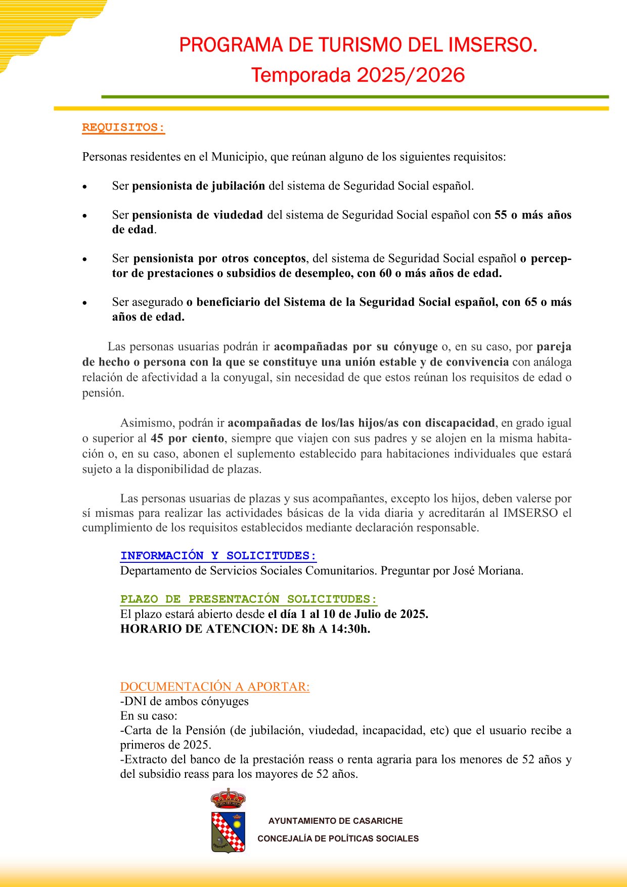 El Ayuntamiento de Casariche informa que a partir de mañana, 1 de julio, y hasta el 10 de julio, permanecerá abierto el plazo para solicitar el Programa de Turismo del IMSERSO para la temporada 2025/2026.
