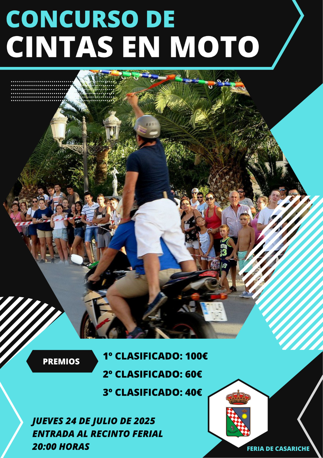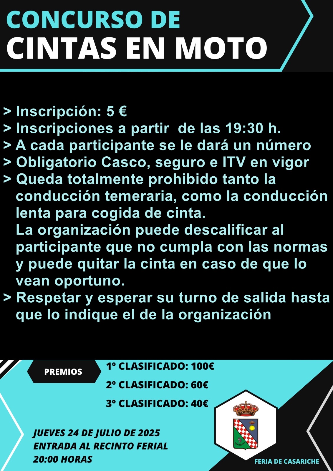 Dentro de la programación del verano deportivo y enmarcada en los actos de la Feria de Santiago, hoy anunciamos que la Carrera de Cintas en moto tendrá lugar el próximo jueves 24 de julio, a partir de las 20:00 horas, en la entrada del Recinto Ferial.