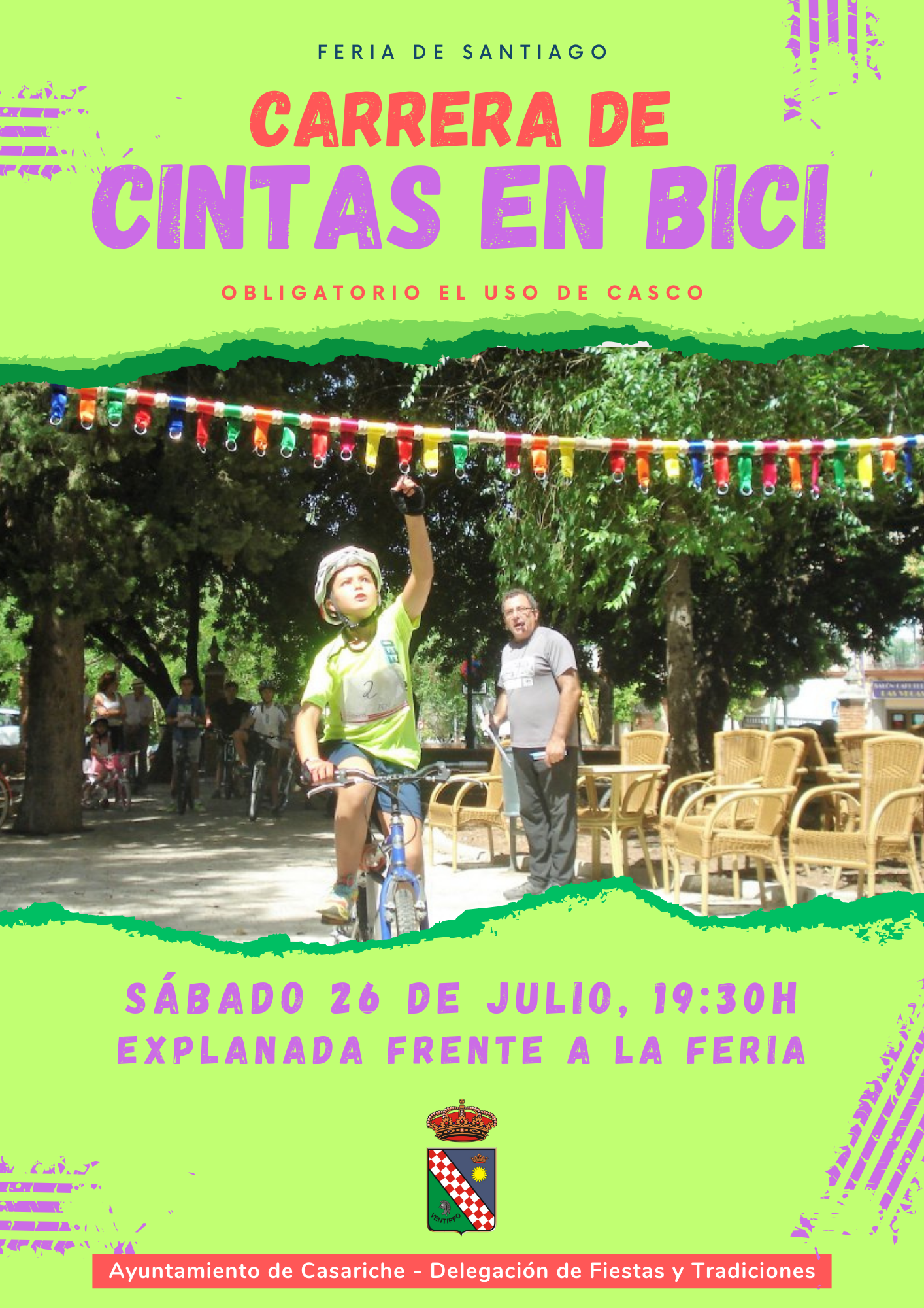 El sábado 26 de julio, a partir de las 19:30 horas, la explanada situada frente a la Feria se llenará de diversión durante la celebración de la Carrera de Cintas en bicicleta, dirigida especialmente a los más jóvenes, que combina deporte, destreza y entretenimiento, en la que los y las participantes deberán demostrar su habilidad sobre dos ruedas para atrapar las cintas al vuelo.