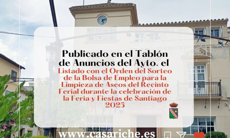 Desde el Área de Empleo, informamos que ya se puede consultar tanto en el Tablón de Anuncios del Ayuntamiento como en el E-Tablón el Listado con el Orden del Sorteo de la Bolsa de Empleo para la Limpieza de Aseos del Recinto Ferial durante la celebración de la Feria y Fiestas de Santiago 2025