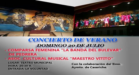 El domingo 20 de julio, a partir de las 20:30 horas, se llevará a acabo en nuestro Teatro Municipal un Concierto de Verano, que contará con las actuaciones de la Comparsa Femenina «La Banda del Bulevar», de Pedrera, y de la Asociación Cultural Musical «Maestro Vitito» de Casariche. Esta actividad cultural cuenta con la colaboración del Excmo. Ayuntamiento de Casariche.