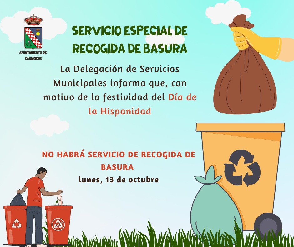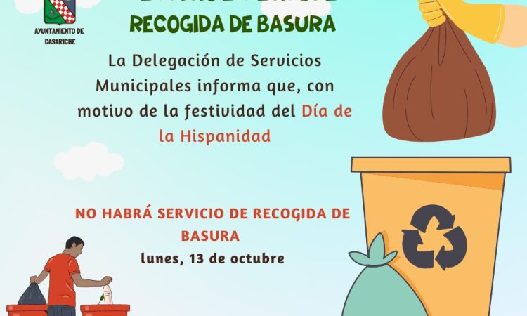La Delegación de Servicios Municipales del Ayuntamiento informa que, con motivo de la festividad del 12 de octubre, Día de la Hispanidad y pasarse el festivo al lunes día 13, la noche del lunes 13 al martes 14, no habrá servicio de recogida de basura.