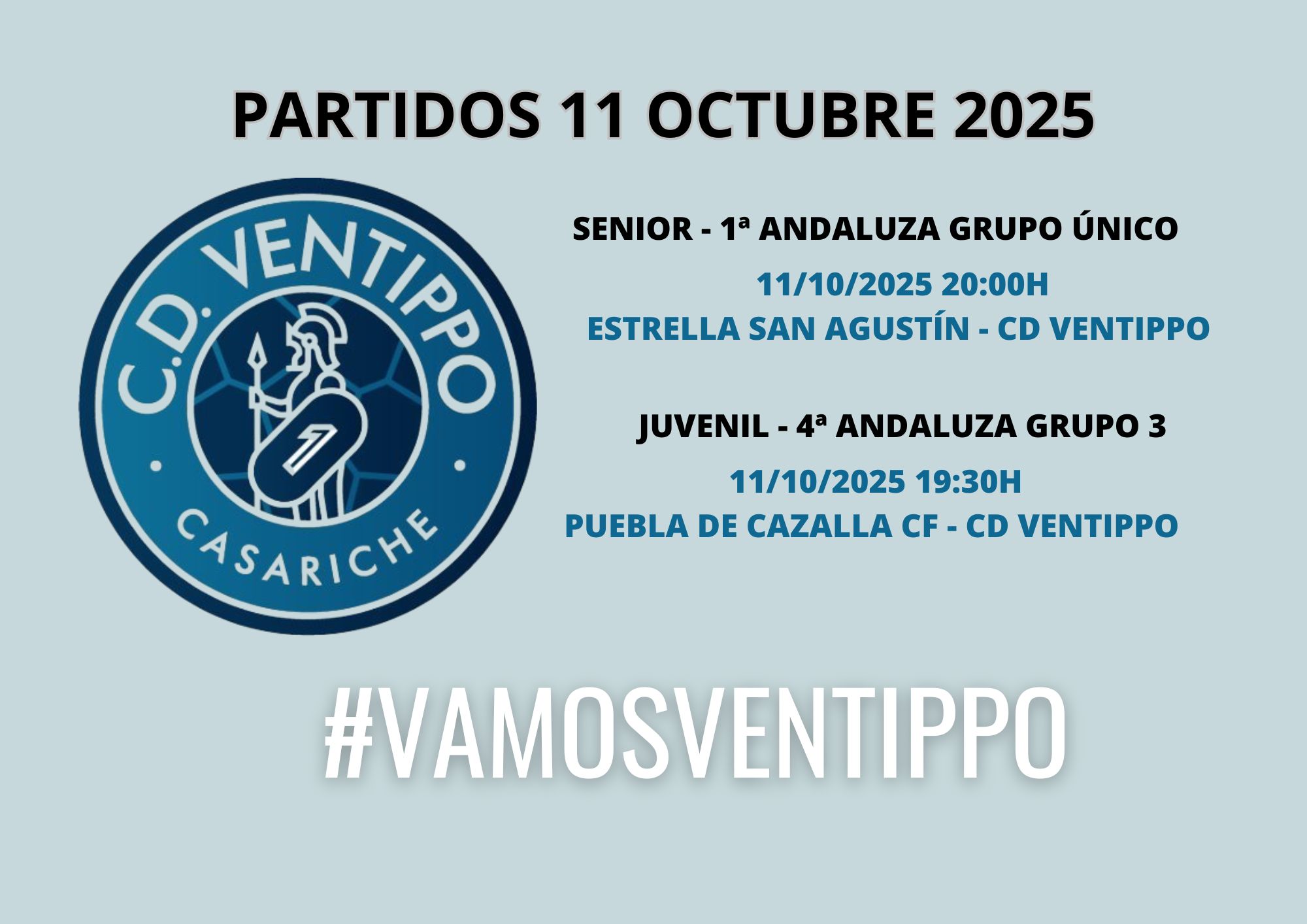 La actividad deportiva del fin de semana viene marcada por la participación los Prebenjamines de la Escuela de Fútbol de Casariche en un Torneo Prebenjamín el sábado 11 de octubre, dentro del acto inaugural de la Temporada 2025/2026 de la Escuela de Fútbol Peloteros, y los partidos de los juveniles y senior del CD Ventippo que juegan fuera.