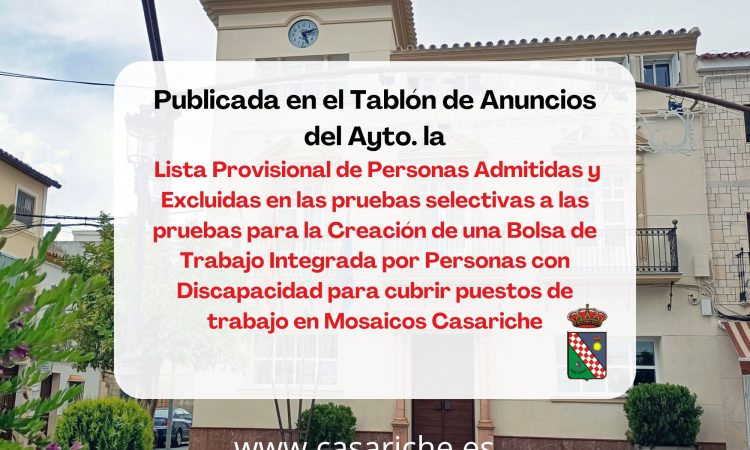 Desde la Delegación de Empleo informamos que se ha publicado tanto en el Tablón de Anuncios del Ayuntamiento como en el E-Tablón la Lista Provisional de Personas Admitidas y Excluidas en las pruebas selectivas para la Creación de una Bolsa de Trabajo Integrada por Personas con Discapacidad para cubrir puestos de trabajo por circunstancias de la producción y sustitución de persona trabajadora, de Operario de Elaboración de Mosaicos en el Centro Especial de Empleo, Mosaicos Casariche, S.L.U.