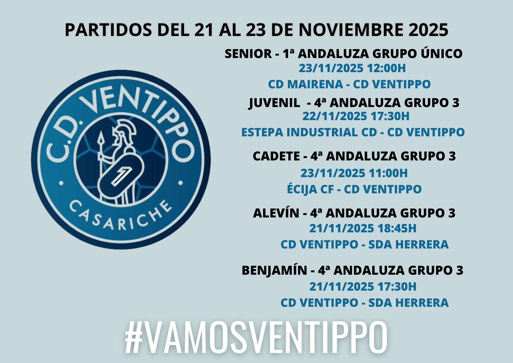 Las próximas actividades deportivas para nuestros equipos comienzan esta tarde en Casariche con los partidos de los benjamines y alevines del CD Ventippo, en un fin de semana en el que compiten todas sus categorías: