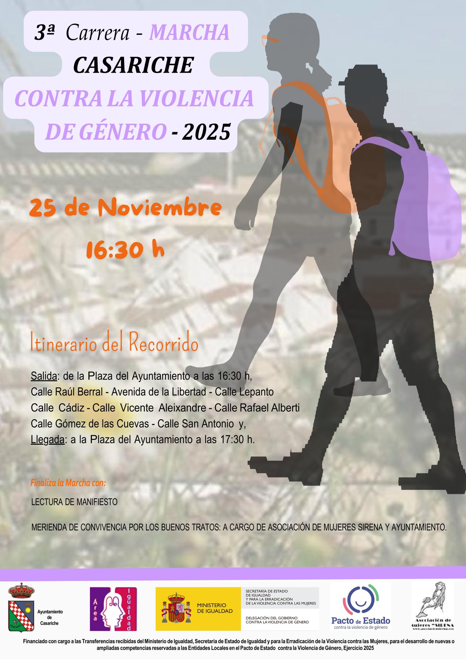 A las 16:30 horas dará comienzo la tercera Carrera-Marcha Casariche contra la violencia de género, cuyo recorrido tendrá salida y llegada en la Plaza Alcalde José Ramón Parrado Cano. Al término de la misma, se procederá a la lectura del manifiesto conmemorativo.