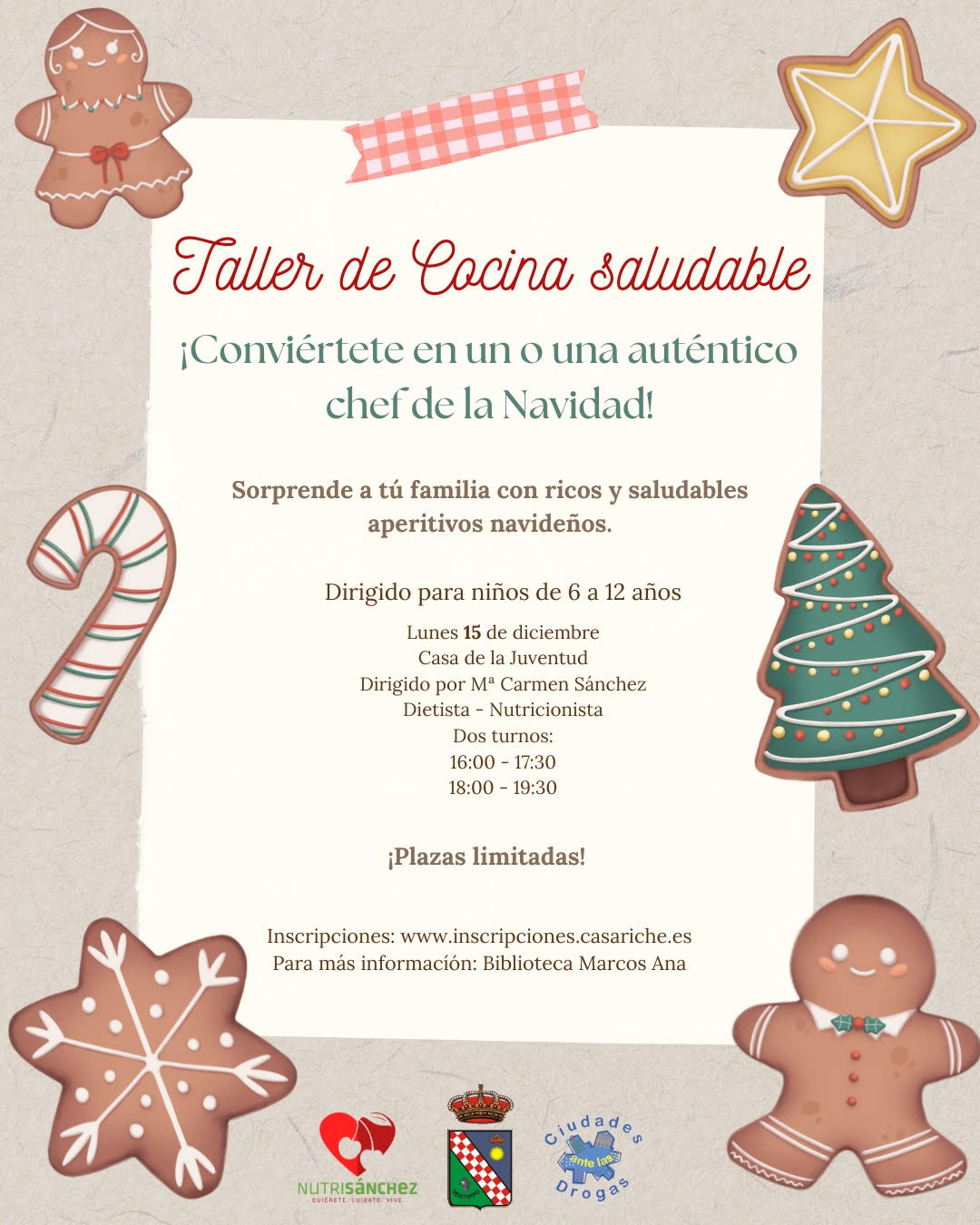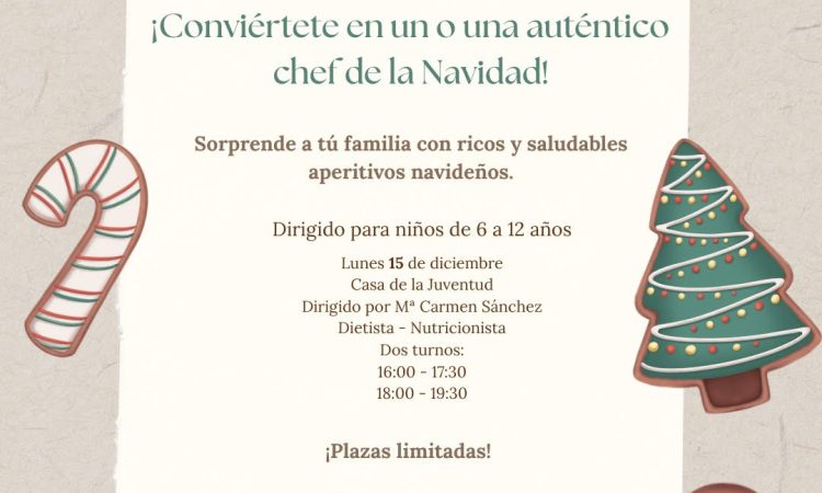 El taller está dirigido a niños y niñas de 6 a 12 años y se celebrará el lunes 15 de diciembre en la Casa de la Juventud. La actividad será impartida por Mari Carmen Sánchez, dietista y nutricionista, y contará con dos turnos a elegir: