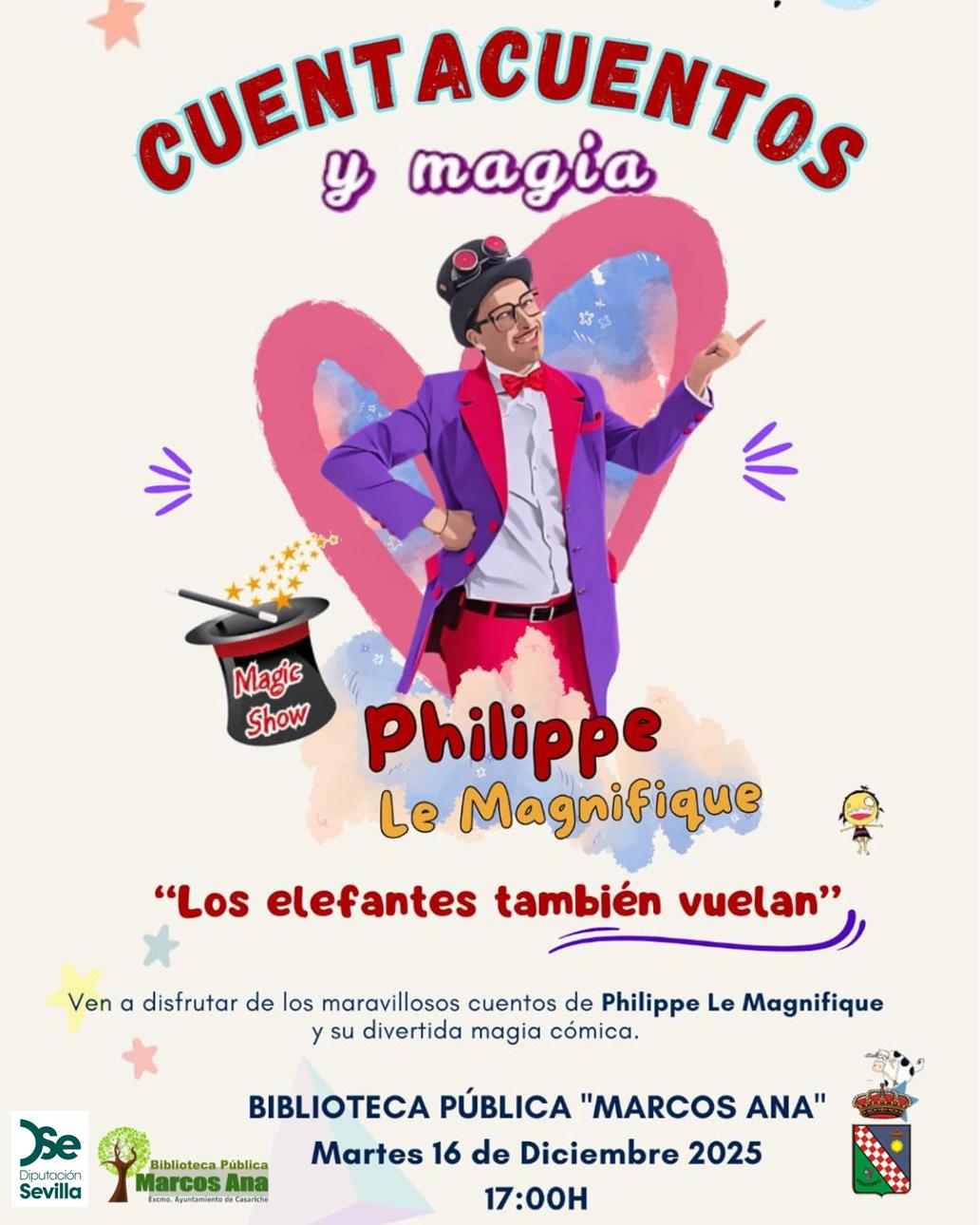 La Biblioteca Municipal “Marcos Ana” acogerá el próximo martes 16 de diciembre, Día de la Lectura en Andalucía, a las 17:00 h, una actividad muy especial para conmemorar esta efeméride: “Los elefantes también vuelan”, un espectáculo que combina cuentacuentos y magia cómica de la mano de Philippe Le Magnifique y que está dirigido a niños y niñas a partir de 3 años.