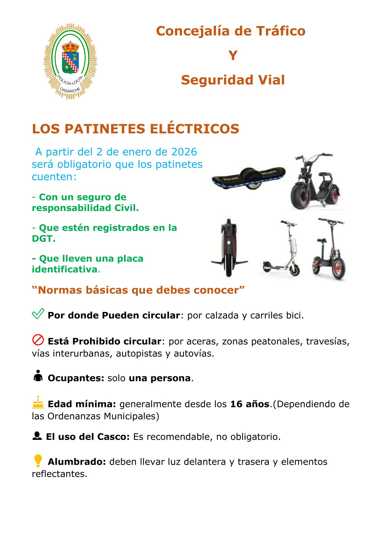 Desde la Delegación de Tráfico del Ayuntamiento de Casariche, en colaboración con la Jefatura de la Policía Local, queremos recordar a todos nuestros vecinos y vecinas que, a partir del 2 de enero de 2026, entrará en vigor una nueva normativa para el uso de patinetes eléctricos, destinada a garantizar la seguridad vial y promover una movilidad sostenible y responsable.