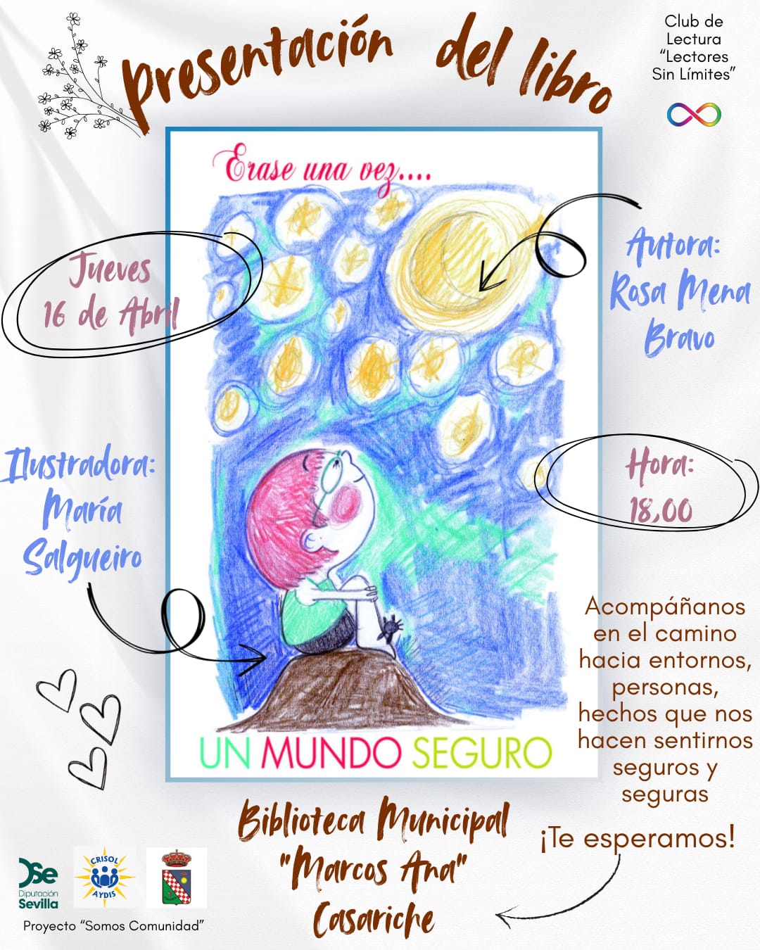 Hoy tenemos el placer de informar que el próximo jueves 16 de abril, a las 18:00 horas, la Biblioteca Municipal “Marcos Ana” acogerá la presentación del libro “Érase una vez un mundo seguro”, obra de la psicóloga y terapeuta familiar Rosa Mena Bravo, que cuenta con las ilustraciones de María Salgueiro, quien estará presente en el acto y realizará un dibujo en vivo durante la presentación.