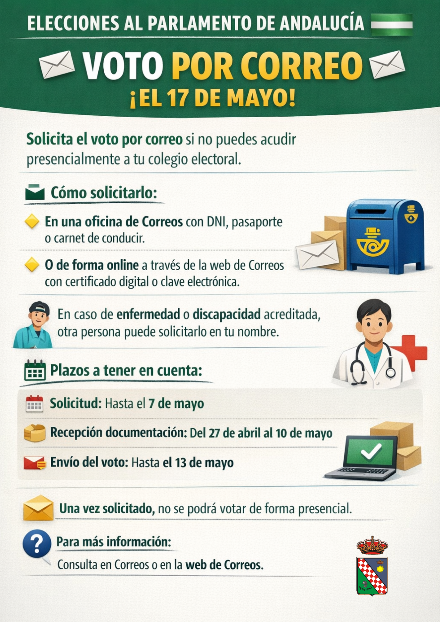 El Ayuntamiento de Casariche informa que ya se encuentra abierto el plazo para solicitar el voto por correo de cara a las próximas elecciones al Parlamento de Andalucía, que se celebrarán el próximo 17 de mayo.